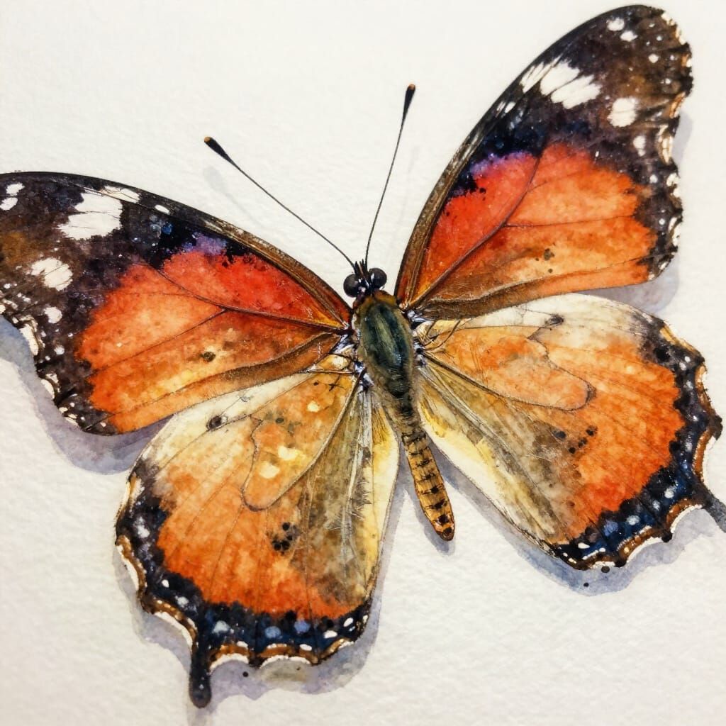 This image showcases a detailed watercolor painting of a vibrant butterfly, highlighting delicate wing patterns and body details. The artwork features soft, bleeding colors and visible brushstrokes, reminiscent of classical landscape painters.