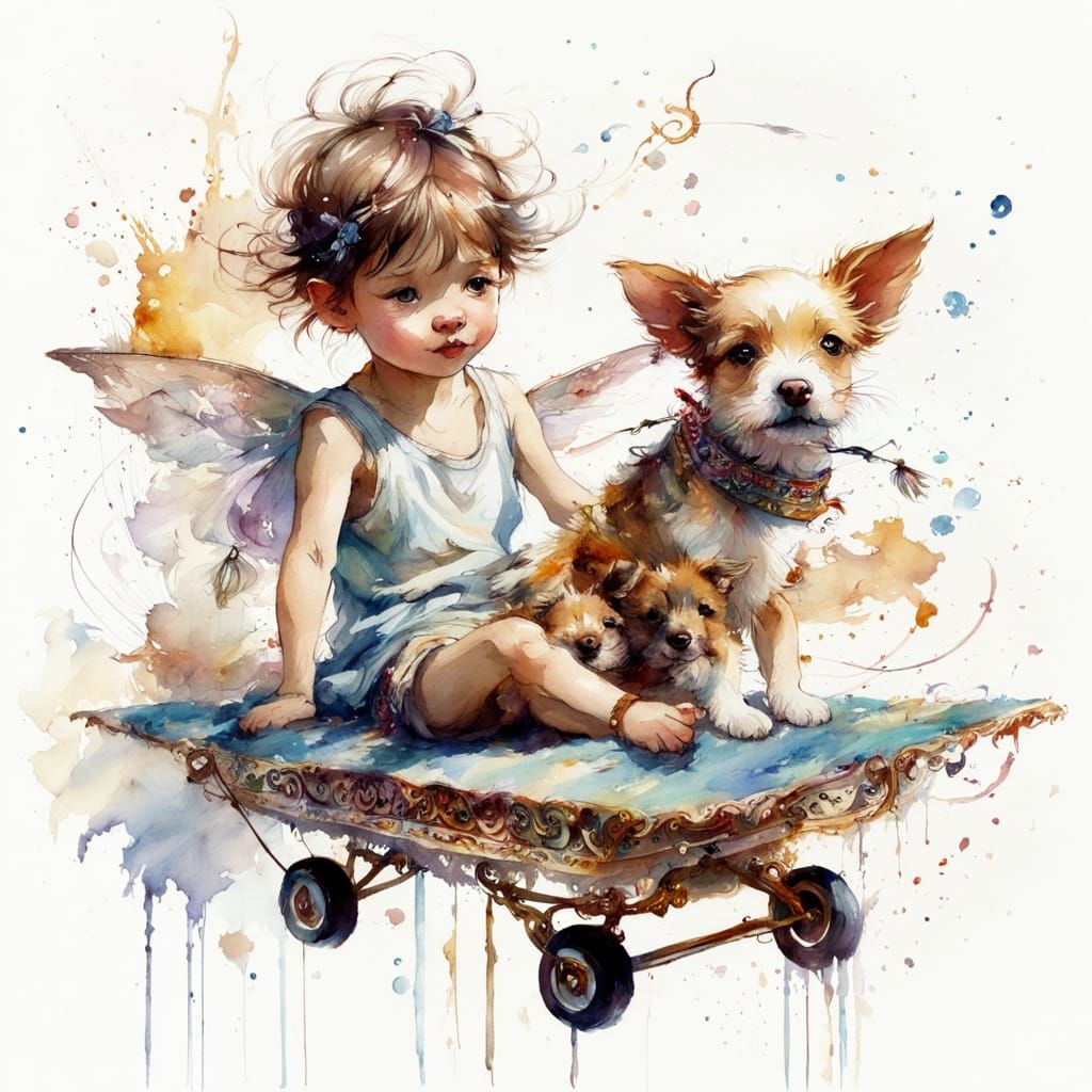 A charming illustration of a pixie and puppy joyfully riding a magic carpet. The artwork features delicate watercolour techniques and splashy golden elements.