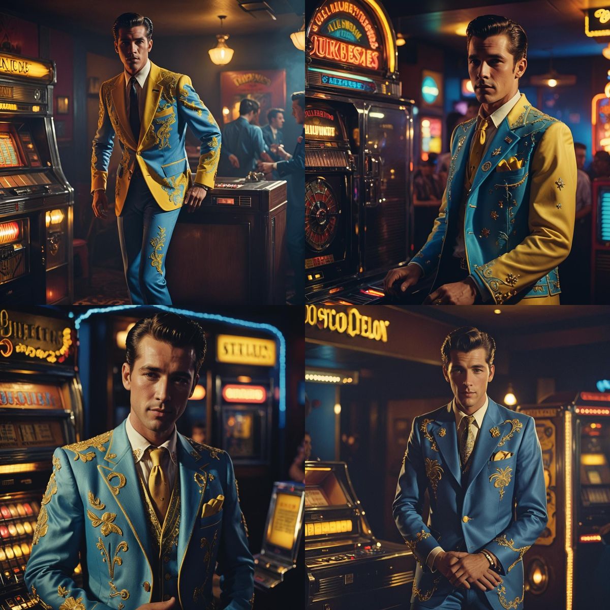 A vivid image of a 1950s country singer in a nightclub, leaning on a jukebox. He sports a blue and yellow embroidered western suit, captured in cinematic detail with atmospheric lighting.