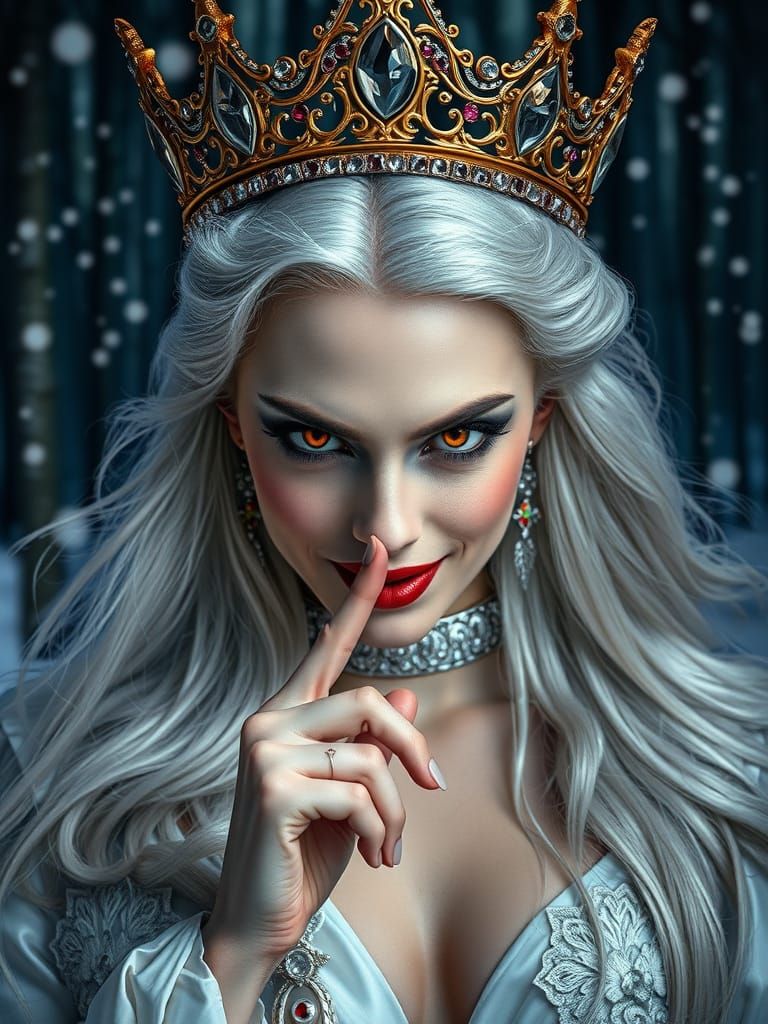 A striking image of a regal vampire queen with white hair and an evil smile, commanding silence in a moody winter forest. Features cinematic lighting and dramatic shadows.