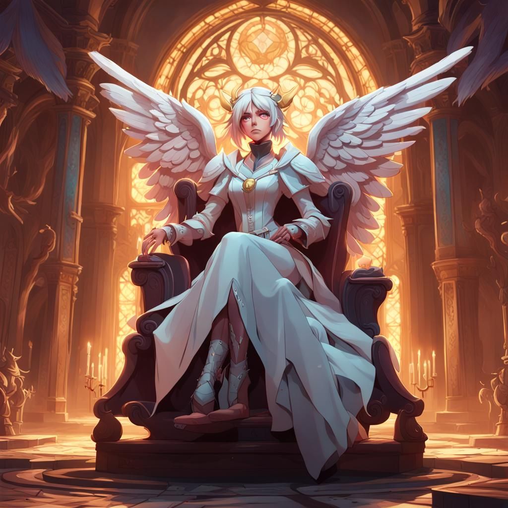 A vibrant digital portrait of Angel Dust seated on a throne, glaring intensely with luminous eyes. The artwork features dynamic lighting, intricate details, and a vivid color palette.