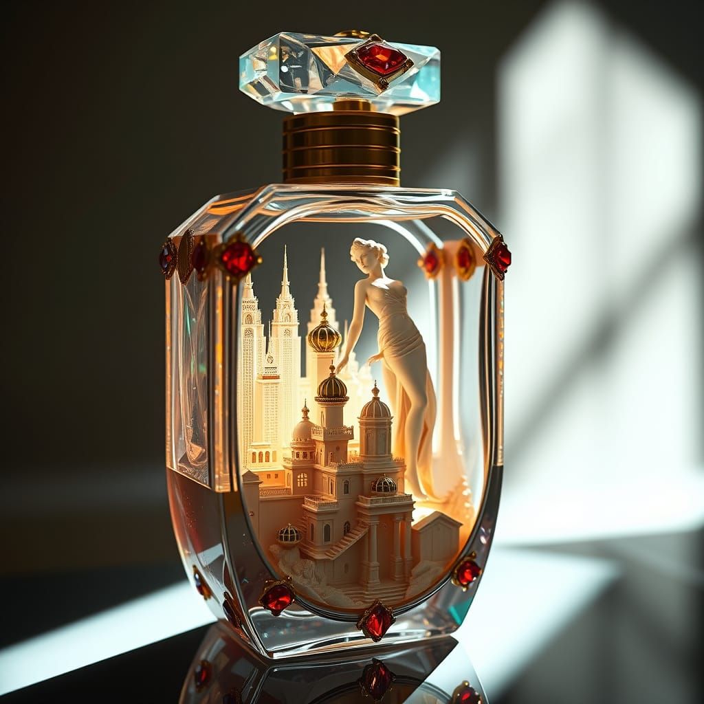 A hyperrealistic image of a perfume bottle featuring fire opal and gold accents. The bottle contains a miniature Escher-style cityscape and luxury sculpture, illuminated with photorealistic studio lighting.