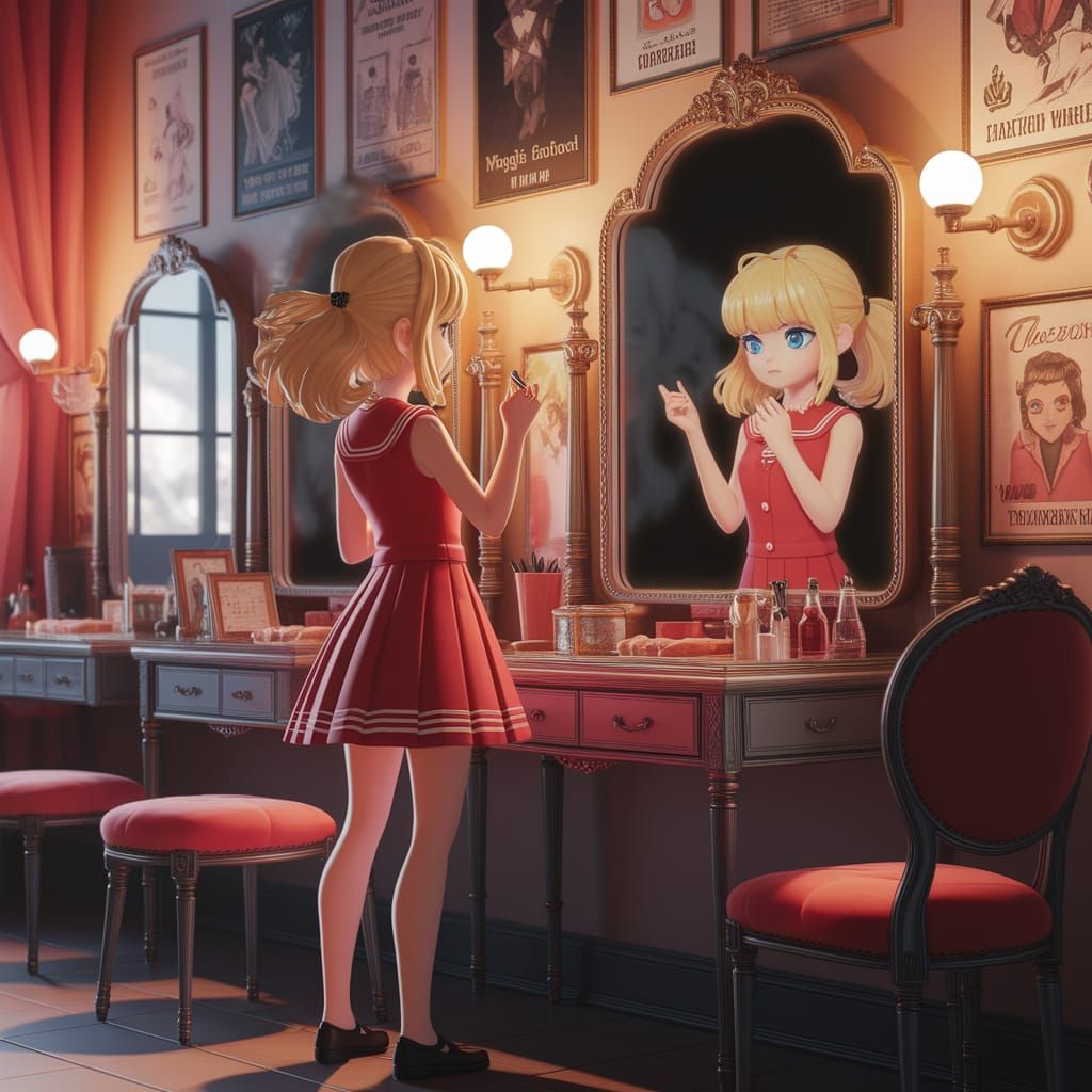 This captivating image shows a teenage girl in a magical theater's dressing room, applying makeup with her mysterious shadowy reflection hinting at secret powers, set in a cozy, warm-lit atmosphere with vintage posters and fine 3D anime details.