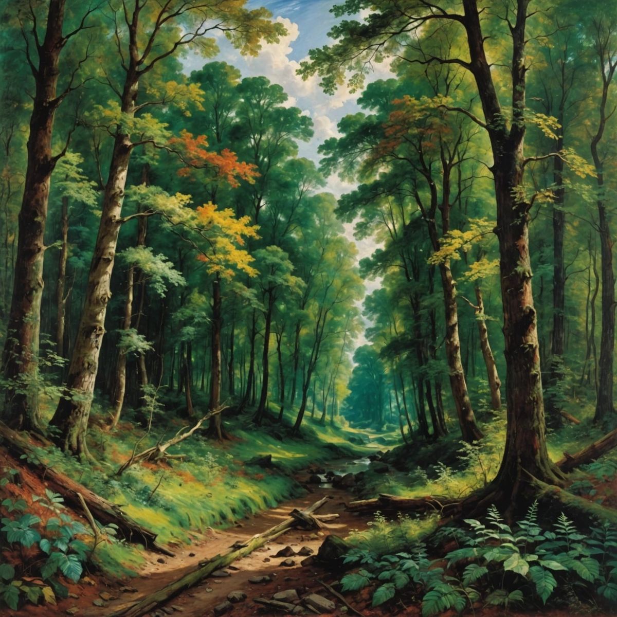 This image shows a detailed forest path with puddles, rendered in deep jewel tones with a style reminiscent of John Constable's landscape paintings.