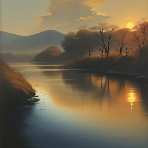This serene landscape features a sun shining over a river, depicted in a delicate ink wash style with gentle brushstrokes and soft focus, evoking peaceful Japanese art.
