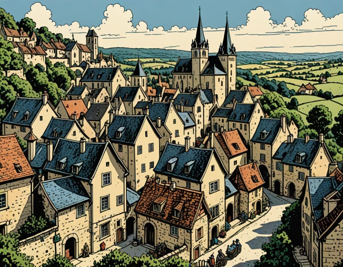 This image shows a detailed illustration of a medieval village in France. The artwork features vibrant colors and a style reminiscent of classic comic books.