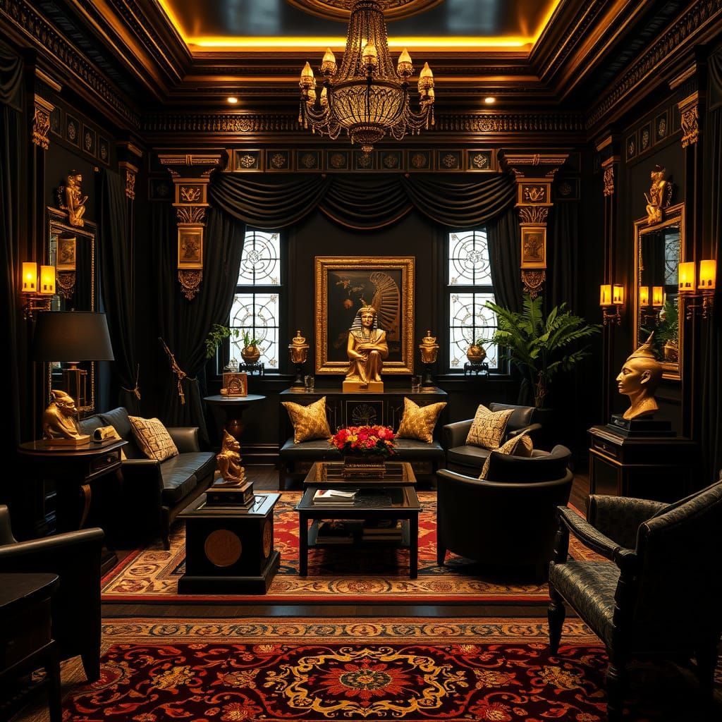 This lavishly decorated space transports you to ancient Egypt, with opulent black and gold accents, intricate hieroglyphics, and luxurious textiles, evoking refined elegance and mystery.