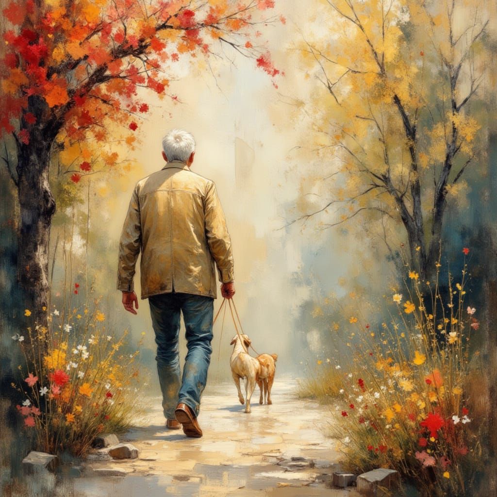 A textured painting of an older man walking his dog. The artwork is rendered with thick brushstrokes and layers of gouache watercolors, reminiscent of impressionist masterpieces.