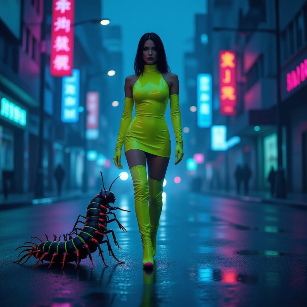A striking image of a woman in a vibrant, acid-colored latex dress and glowing heels walks through a neon-lit futuristic city at night, accompanied by a centipede. Cinematic, atmospheric lighting.