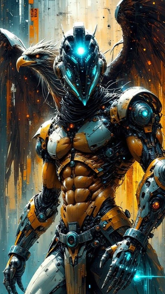 A fusion of power and precision, this cybernetic warrior stands radiant beneath the eagle’s wings. Metallic sinew, glowing energy, and symbolic grace converge into a vision of futuristic strength and mythic grandeur.