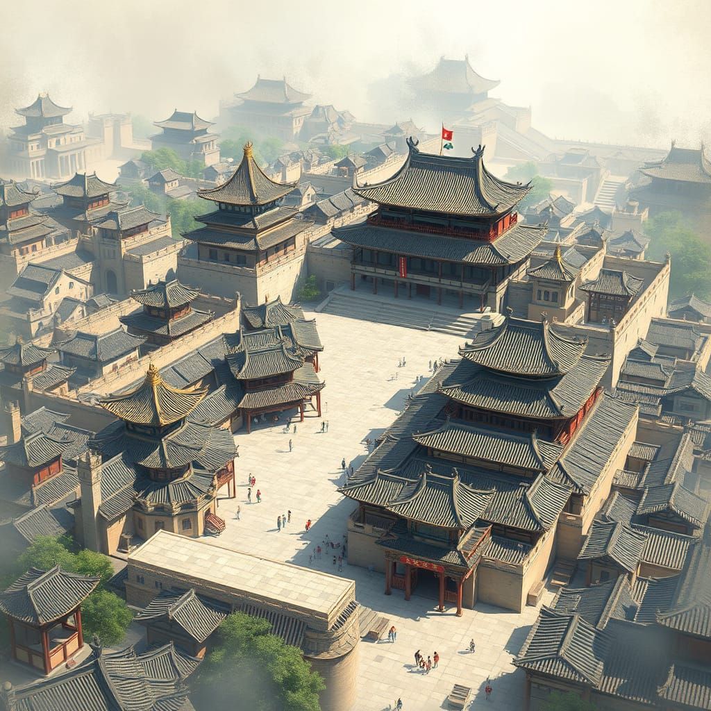 This image showcases an ancient Chinese city enclosed by defensive walls. It features grid-patterned streets and a central axis, designed with curved roofs and traditional temples in digital painting style.