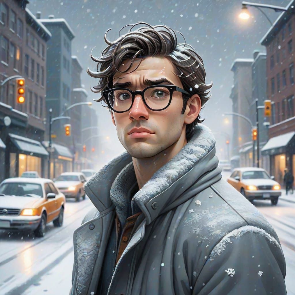 This image shows a young man in glasses amidst heavy traffic during a snowstorm, rendered in a detailed cartoon style with a cold, atmospheric feel.