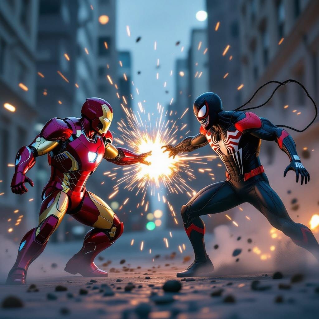 This ultra-realistic image captures a dynamic battle between Iron Man and Dark Spider-Man. A powerful repulsor blast meets dark webs in an explosive energy clash, rendered with cinematic lighting and wide-angle perspective.