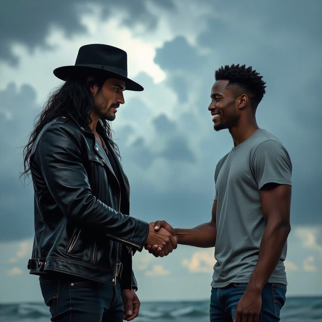 A dramatic image of two men shaking hands against a stormy backdrop. The picture features dramatic lighting and painterly textures, reminiscent of surrealist photography and high-fashion magazines.