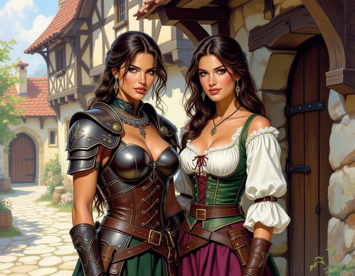 This image shows a female warrior in leather armor and a barmaid in medieval attire outside a village tavern. The artwork evokes 1980s fantasy illustration.