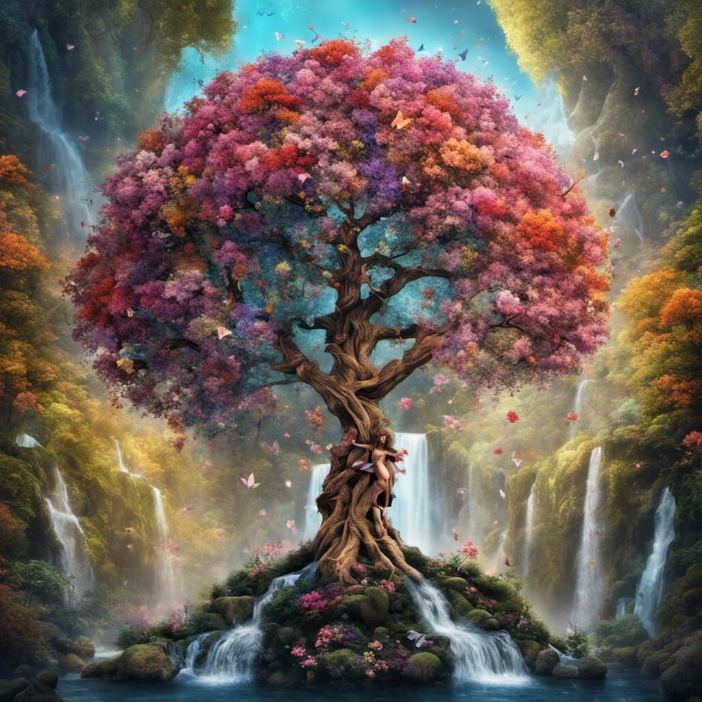 A vibrant depiction of the Tree of Life beside a glittering waterfall, set within an enchanted forest. This detailed matte painting features deep colors and intricate details, rendered as fantasy concept art.