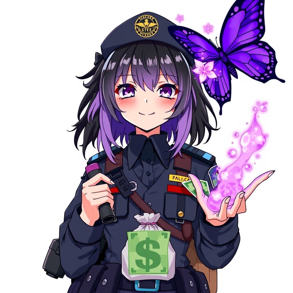 This image features a young anime girl dressed as a policeman, possessed by dark energy, under the control of a mystical purple butterfly. She wears a vibrant purple, black, and lavender hairdo, with a police-style outfit and a purple eyemask.