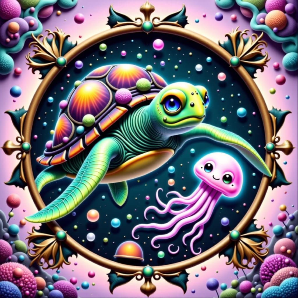 A sea turtle with a seaweed-covered shell swims with its translucent, sparkling jellyfish companion near colorful coral. The whimsical scene evokes a dreamlike, painterly aesthetic.