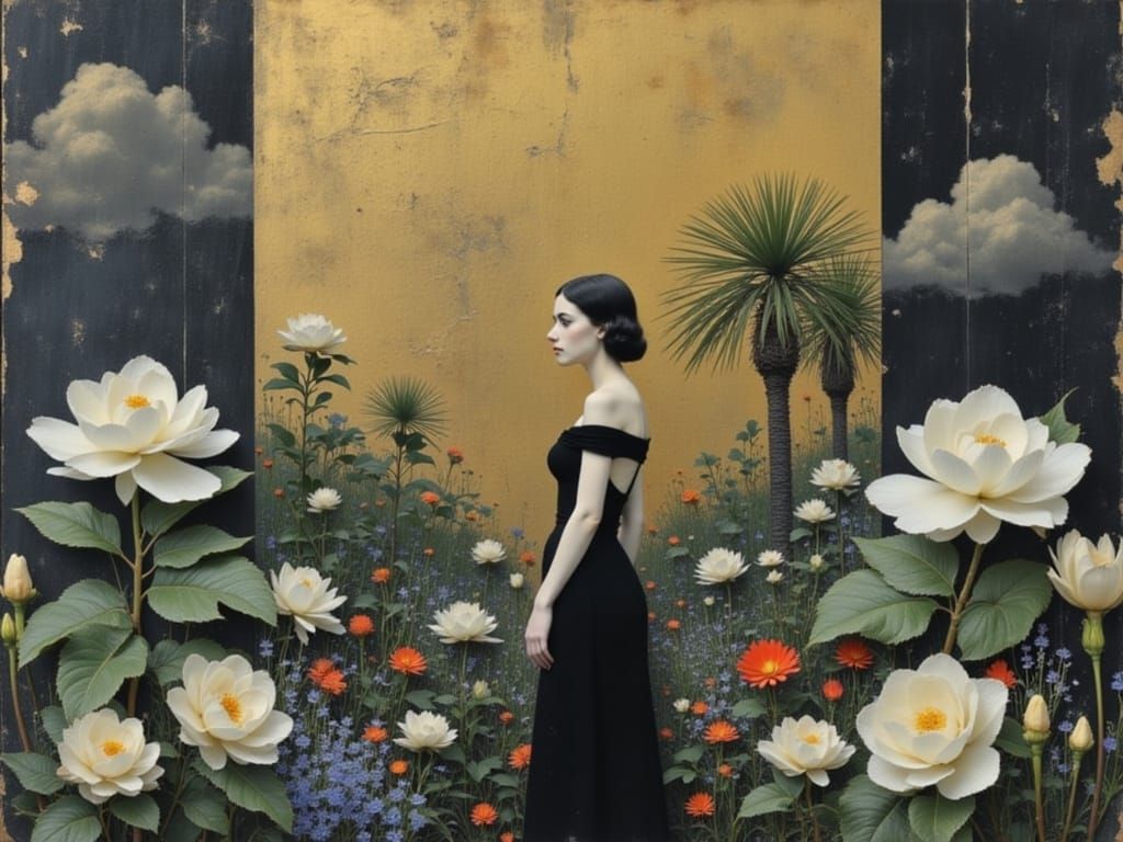 A digital painting of a 1940s nightclub singer in Art Deco style. The singer, in black, white, and gold, stands in a three-dimensional floral garden with a Matrix-inspired tattoo. The artwork features geometric patterns.
