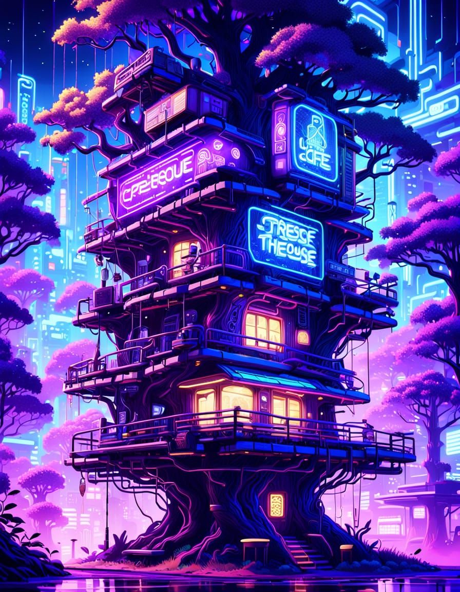 A medium shot of a cyberpunk treehouse cafe, featuring futuristic architecture and dreamlike scenery. The vibrant neon art style is enhanced by glowing blue circuits, purple mist, and warm golden lighting.