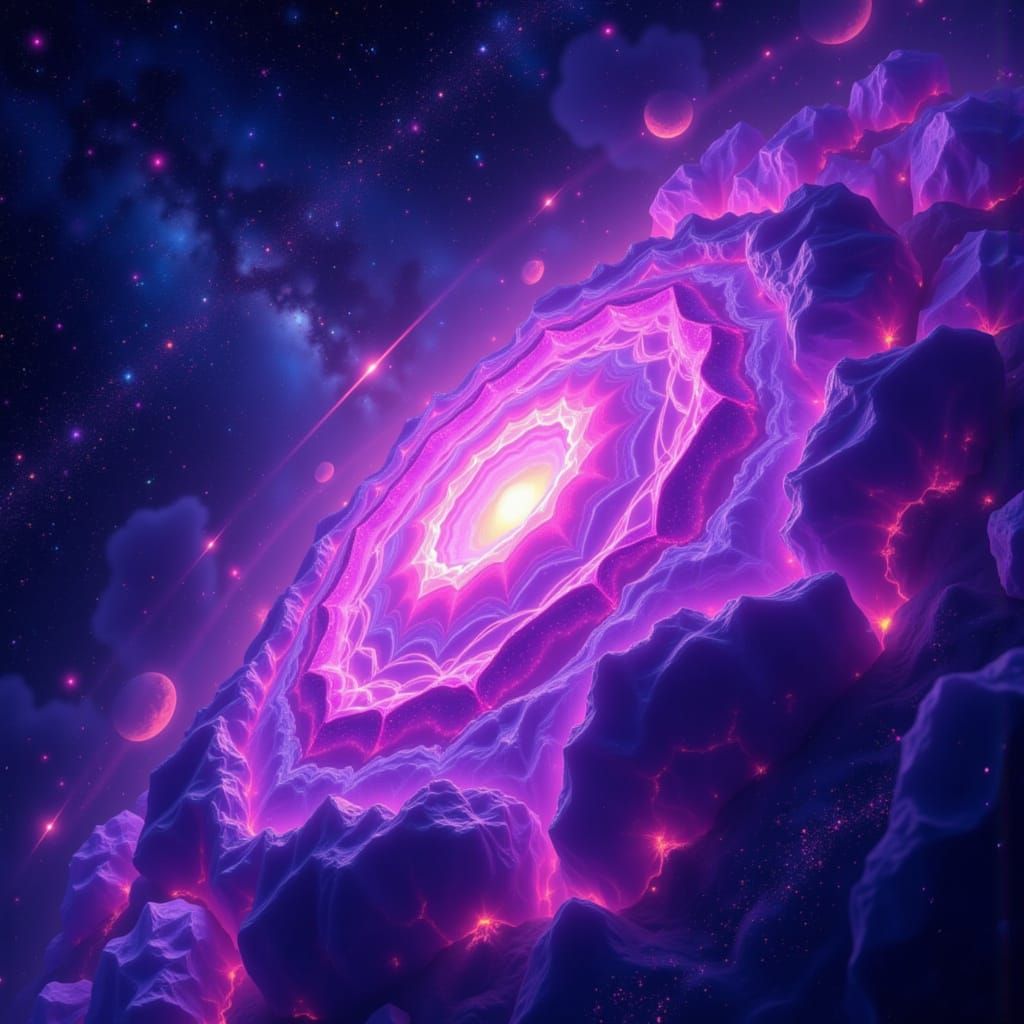 This digital matte painting depicts a night sky filled with swirling amethyst and violet hues, resembling a cosmic geode. Luminous crystals and planetary rings glitter with bioluminescent glows.