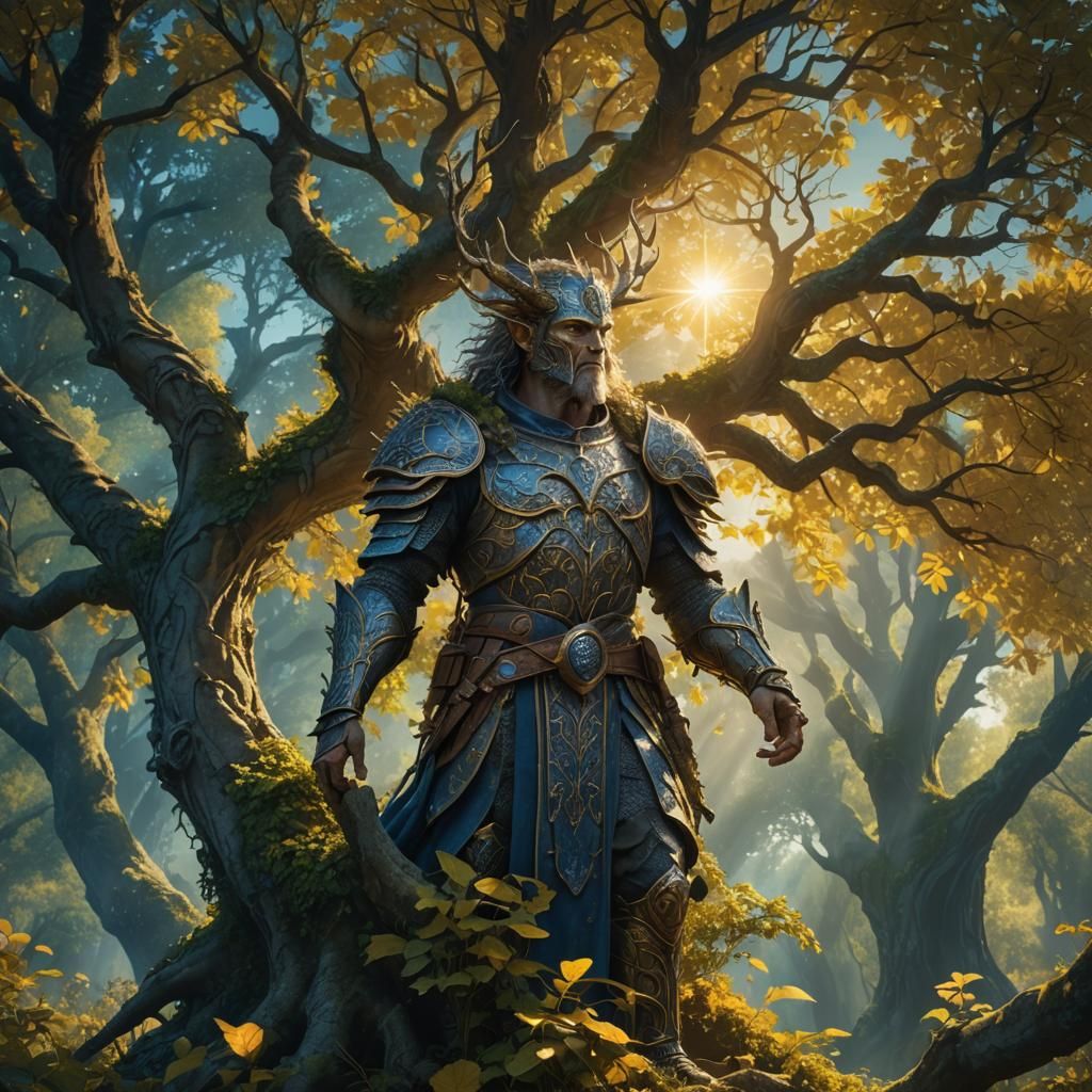 A striking picture of a mystical tree guardian, bathed in light, standing in a vibrant summer landscape. The fantasy art features cinematic lighting and complementary colors in a magical realism style.