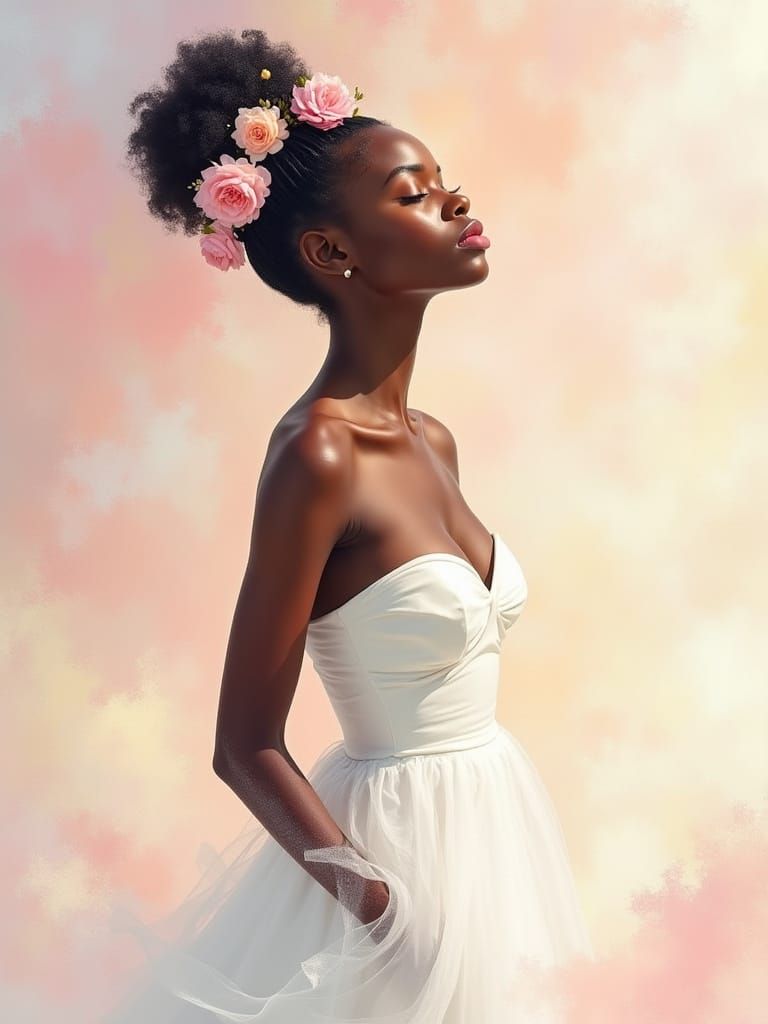 This image shows a Black woman with a high puff hairstyle wearing a flowing white gown. Swirling pastel shapes create an impressionist aesthetic, evoking peace and whimsy.