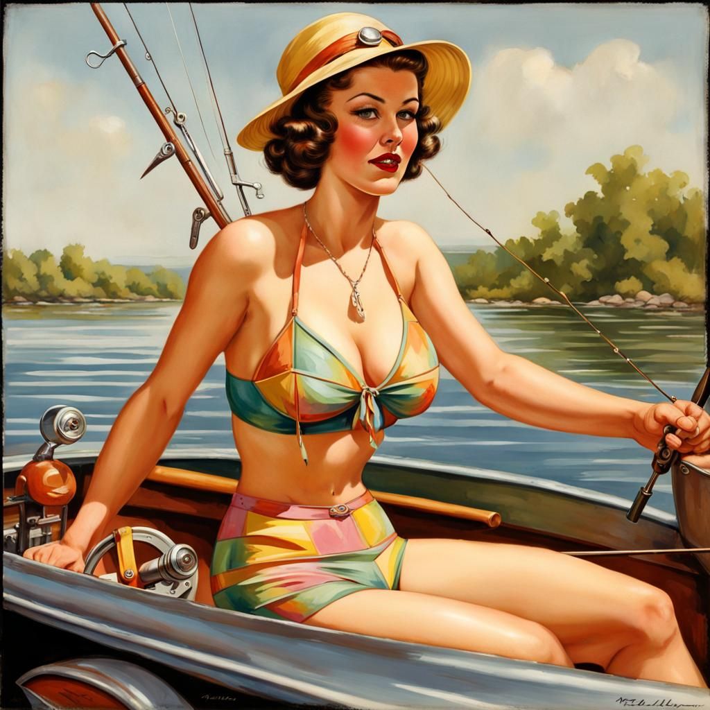 This image shows a 1930s-style pin-up girl fishing from a motorboat. She wears a colorful bikini. The hyperrealistic image uses splash art techniques, intricate detail, and side lighting.