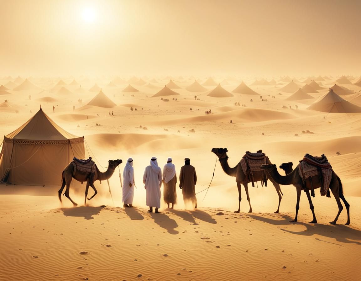 This image shows a desert landscape at sunrise with tents and camels in the background. Warm light and soft dust create an atmospheric and serene scene, reminiscent of classic 35mm film.