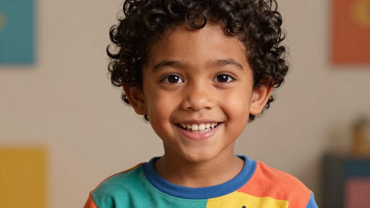 This image features a highly detailed 3D render of a young boy with curly black hair and a radiant smile. The portrait has a warm, friendly atmosphere with vibrant colors and sharp focus.