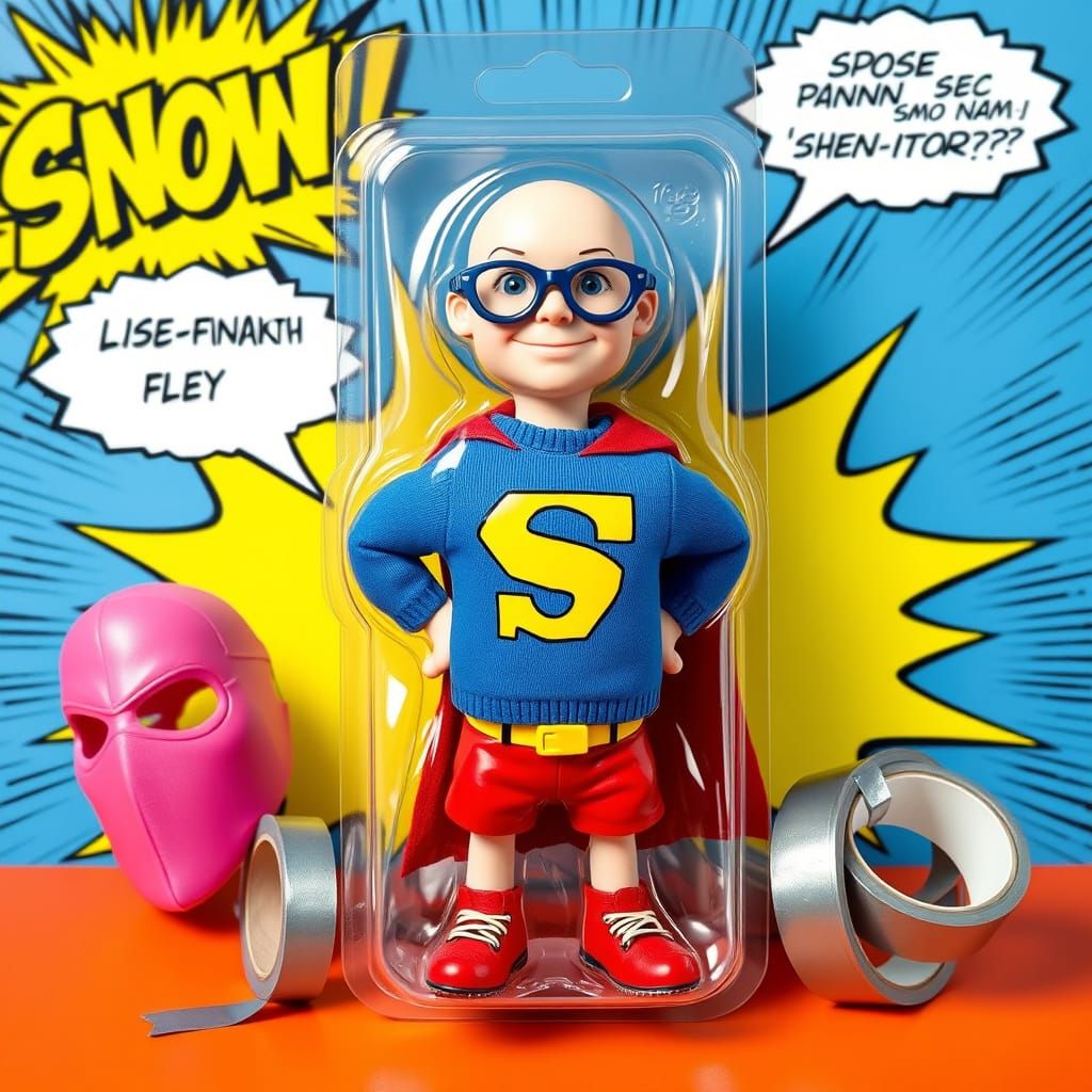 This image depicts a humorous superhero figure, 'SNOW!', standing proudly in a transparent plastic blister pack, surrounded by a colorful comic book-inspired background with explosions and sound effects, and a playful superhero gear set.