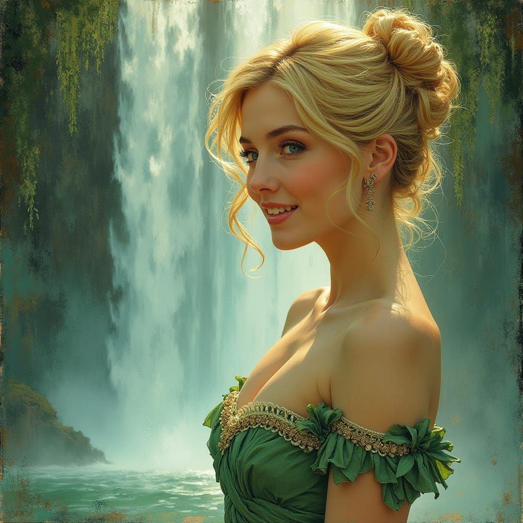 This image shows an elegant European woman with blonde hair in a bun, wearing a short, light green dress. She stands before a scenic waterfall in soft lighting, rendered with delicate details and an enchanting atmosphere.