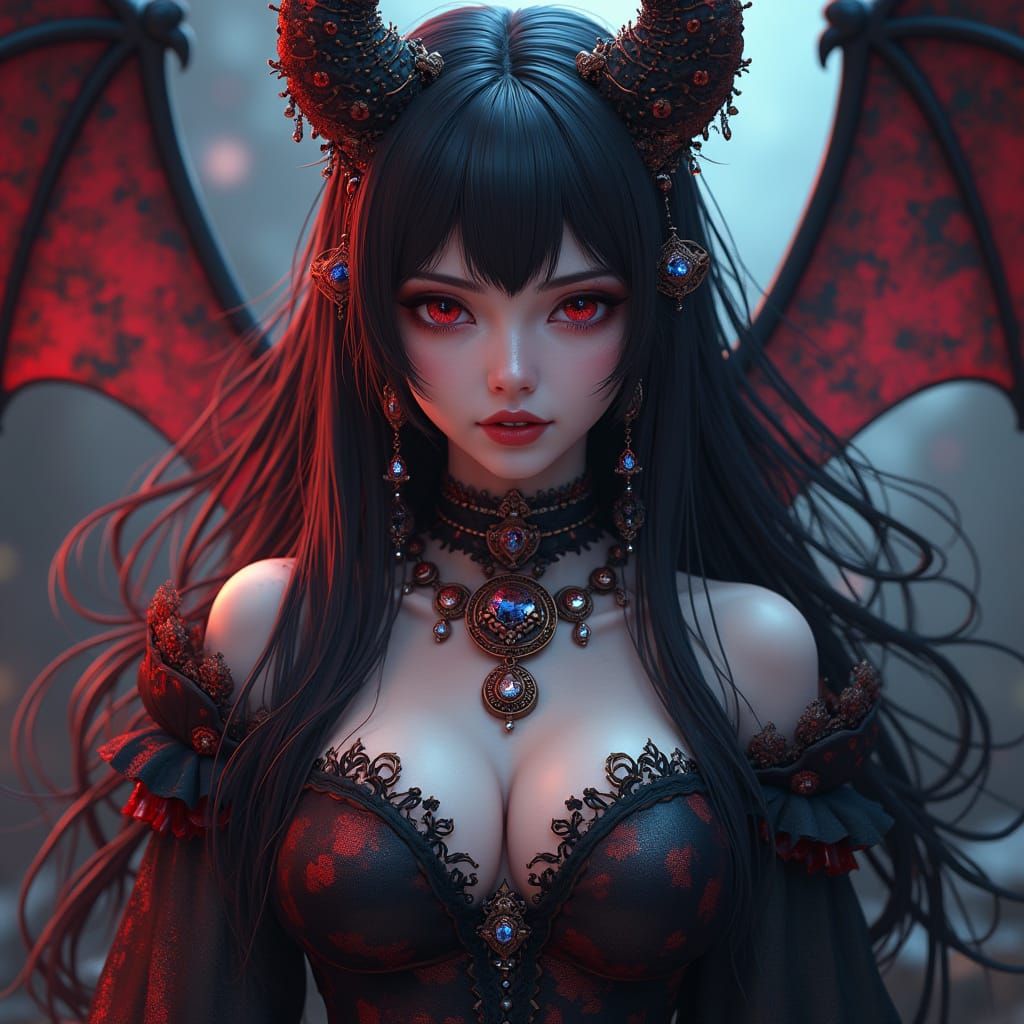 A hyperrealistic portrait of a woman in gothic attire, complete with fangs and ornate jewelry. The image features an anime-inspired aesthetic with vibrant colors and ultra-fine textures, rendered in 8k.