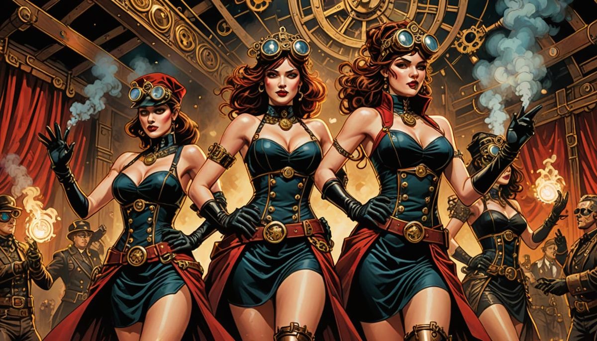 This image shows three steampunk women in asymmetrical dresses performing a show dance on stage. The comic book art style features vibrant ink, golden gears, brass accents, and bold lines in dim red stage lighting.