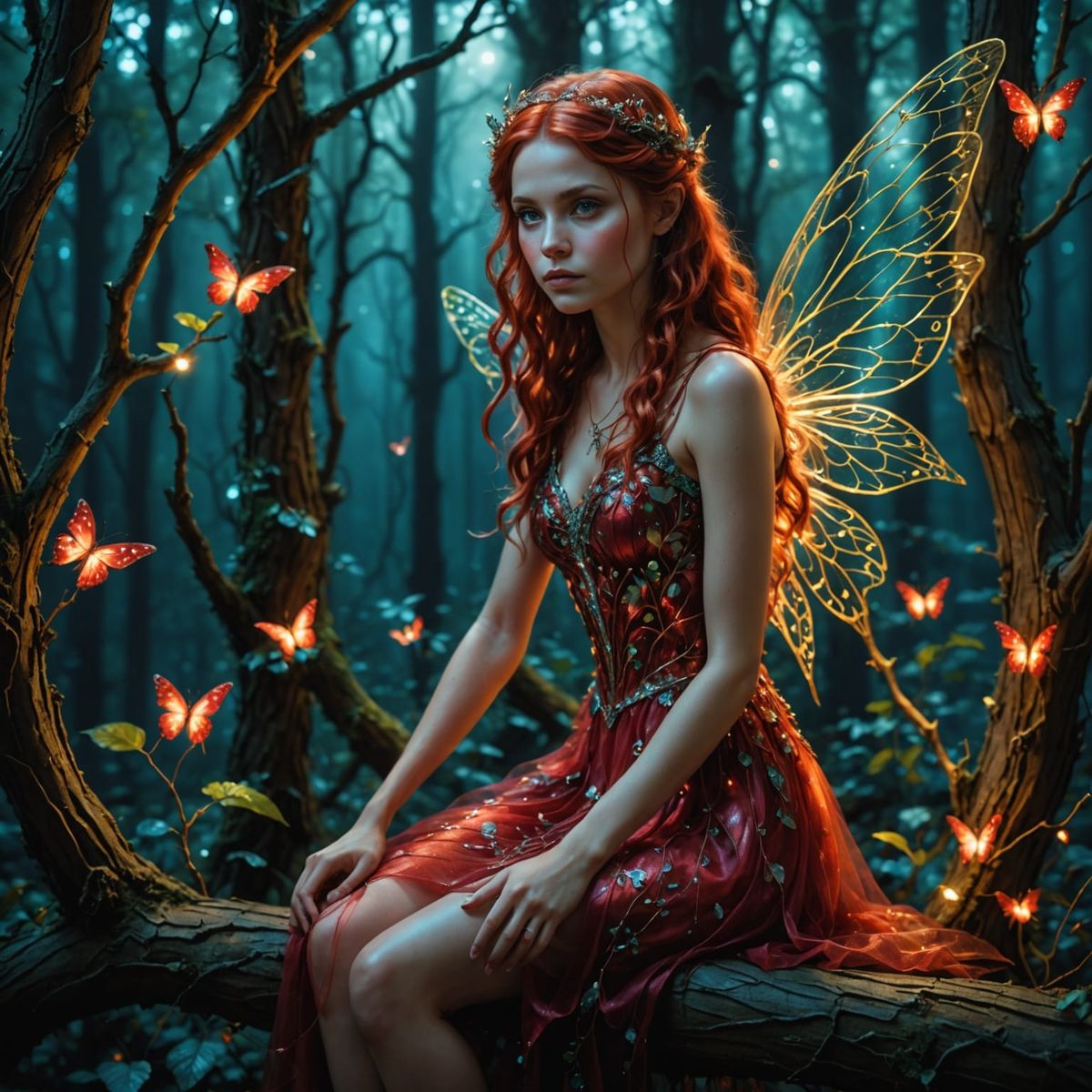 This hyperrealistic image shows a beautiful female fairy with intricate hair and a metallic red dress, sitting on a tree branch in a glowing forest. Masterpiece quality.