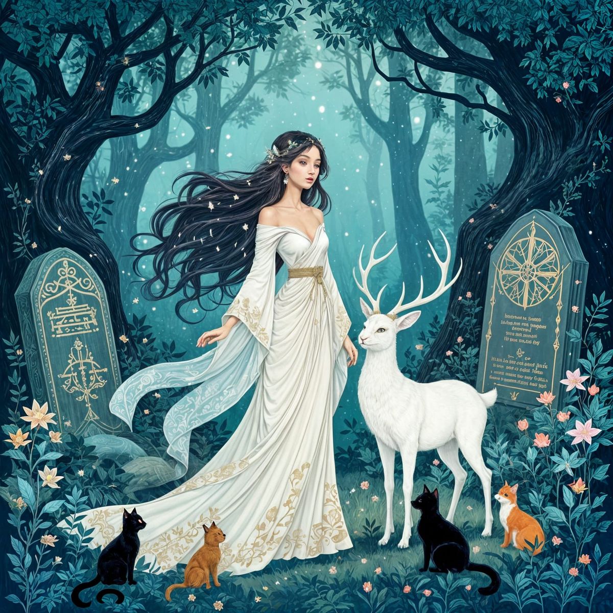 This image shows a woman with starlight in her hair in a glowing forest. Forest animals surround her as she stands next to a white stag. The style evokes art nouveau and Ukiyo-e aesthetics with fantasy concept art elements.