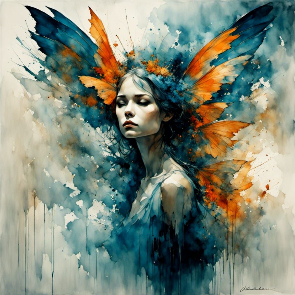 This image shows a beautiful fairy in a blue and orange dress with translucent wings. The fairy's ethereal appearance is enhanced by the vibrant color palette.