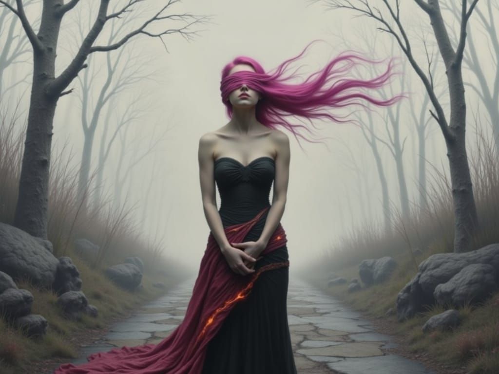 A surreal oil painting depicts a woman with pink hair, blindfolded and bound, expressing exaggerated emotions through Kintsugi cracks on her skin. Golden veins glow, symbolizing resilience and repair in a moody, dramatic scene.