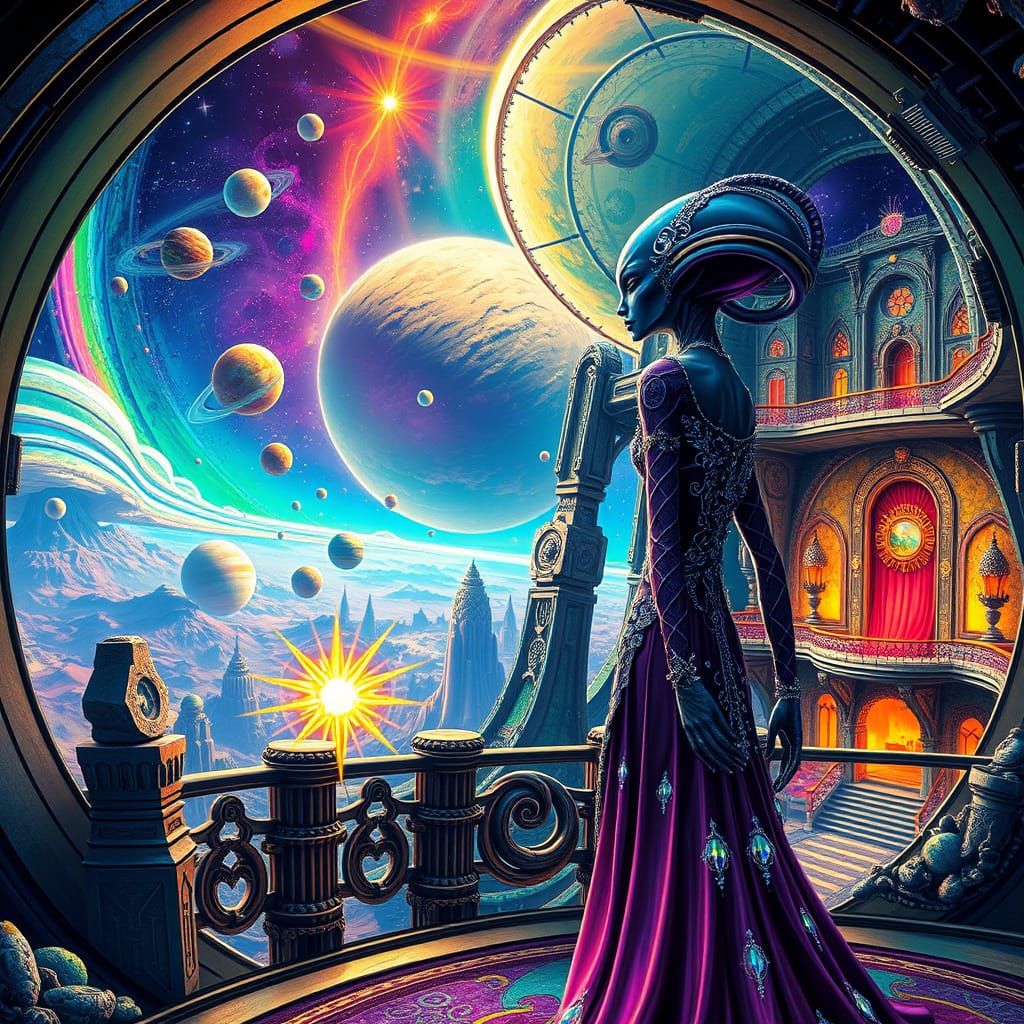 This image depicts a breathtaking, multicolored intergalactic scene viewed through a majestic, multilayered megastructure. An elegantly dressed alien stands transfixed, gazing out at the cosmic scenery with an air of wonder, surrounded by swirling planets, starbursts, and comets in a style that blends H....