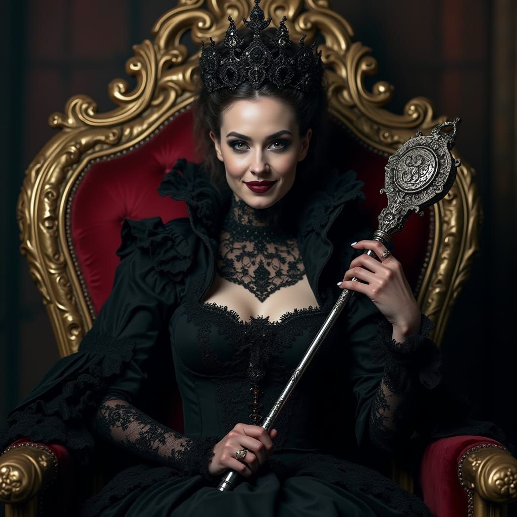 This image shows a regal, gothic queen sitting on a throne, adorned in black lace and velvet, with a sinister smile and piercing eyes. Her scepter, etched with ancient symbols, exudes dark power and authority.