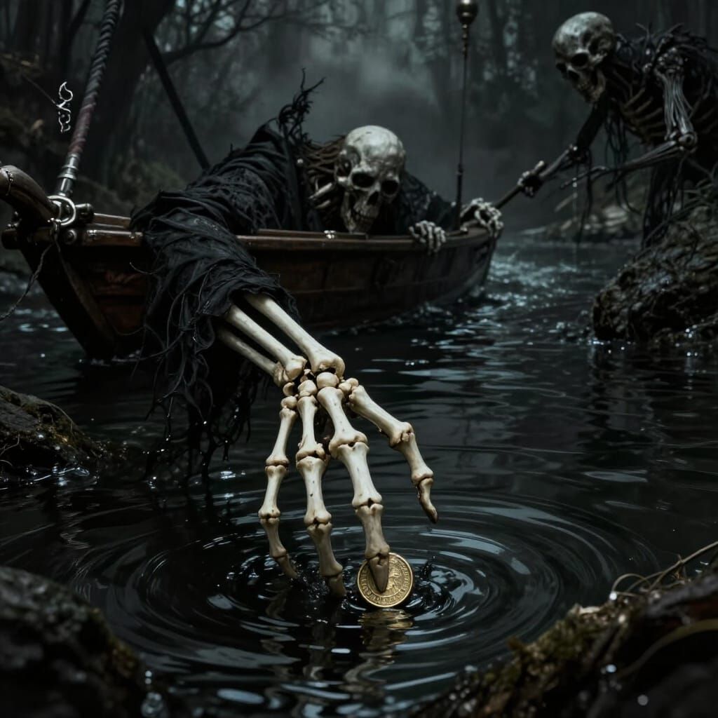 This image shows the River Styx with a skeletal ferryman reaching for a gold coin in a dark, gothic style with dramatic lighting. The atmosphere is grim and ancient.