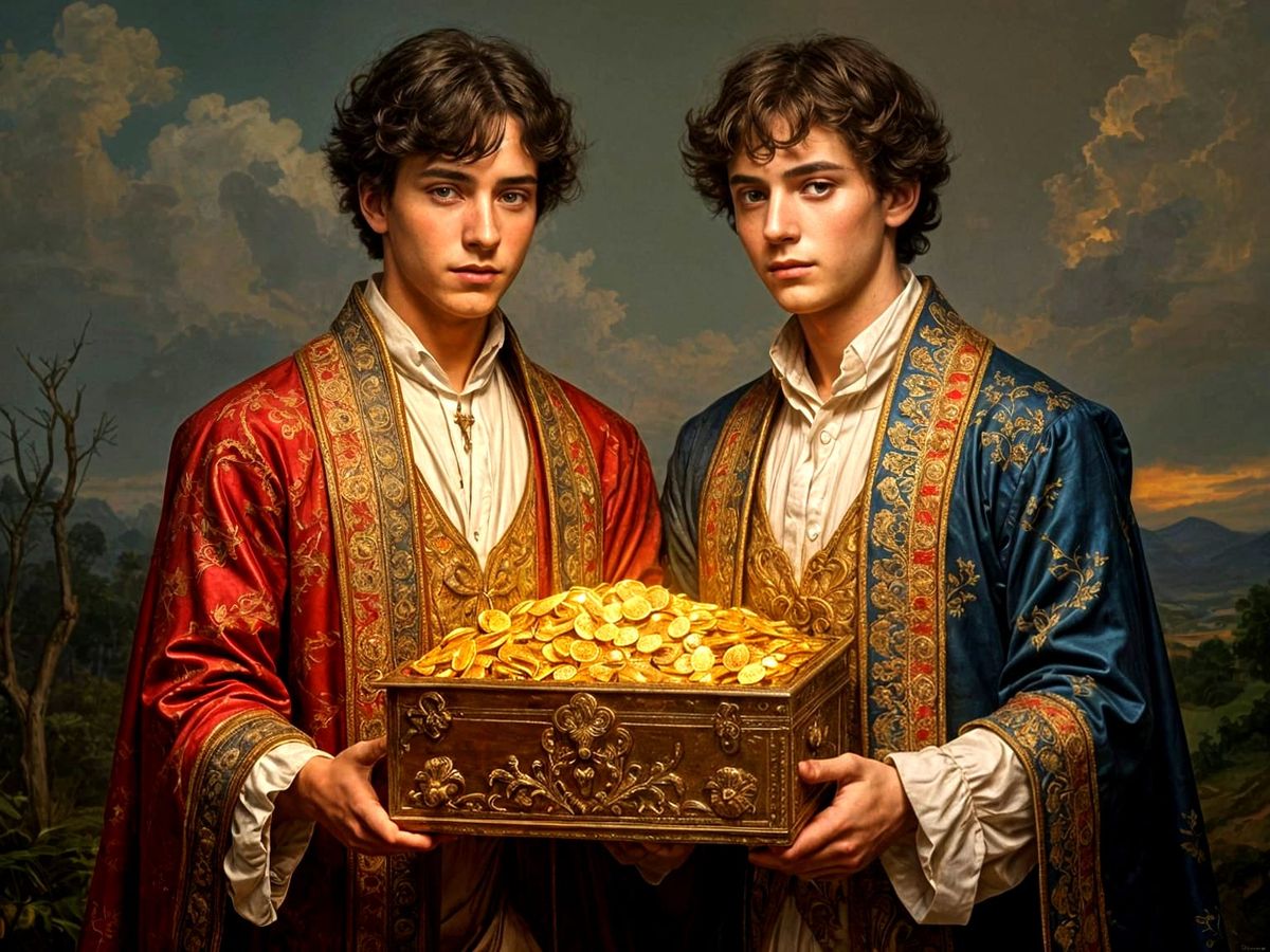 A highly detailed image depicts two young men holding an open treasure chest overflowing with gold. This artwork blends elements of Victorian, Art Nouveau, and Baroque styles with a touch of brutalism.