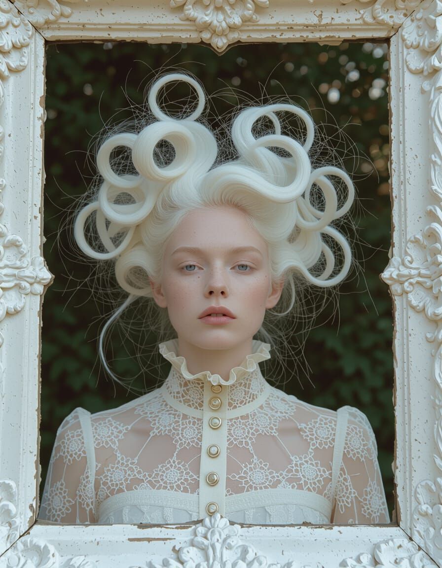 she's hollow mirrors on nature mock her embodied ivory-white hair like scaffolding holds a series of recursive wild mirrors climbing up and around her bunched hair-strands in layered hollowness reflecting the futility of right now pull back into a wide angle wild angle full-length long shot mirroring ...