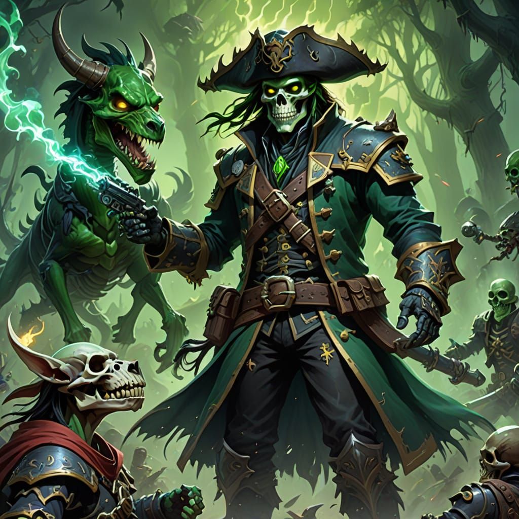This is an epic illustration of a skeleton pirate in colonial attire, drawing a flintlock. A small skeletal dragon sits by him, breathing spectral smoke. The art features dynamic poses and vivid colors.
