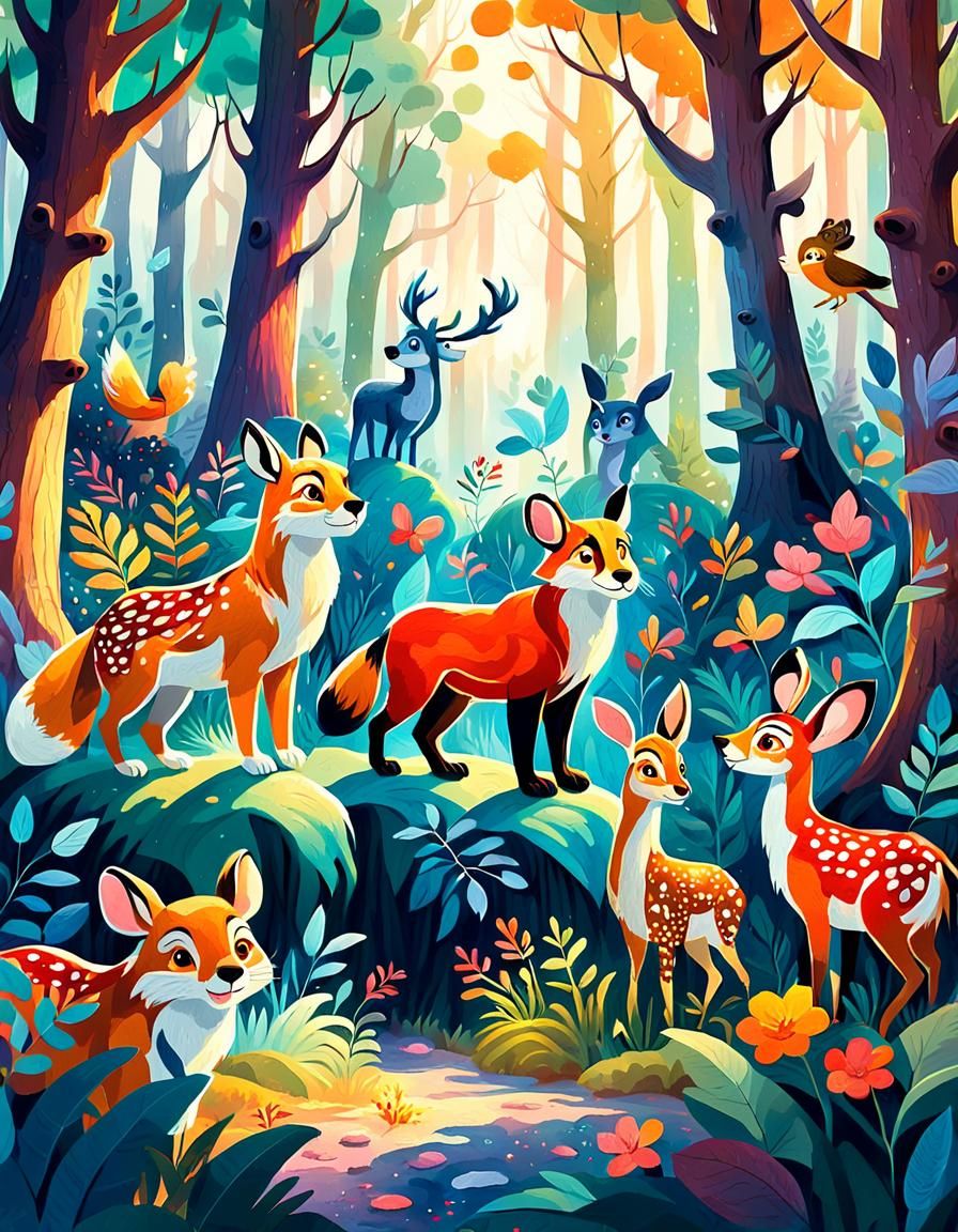This enchanting image depicts a lively group of animals in a colorful, magical forest, captured in a Disney-inspired gouache style with thick brush strokes and textured layers.