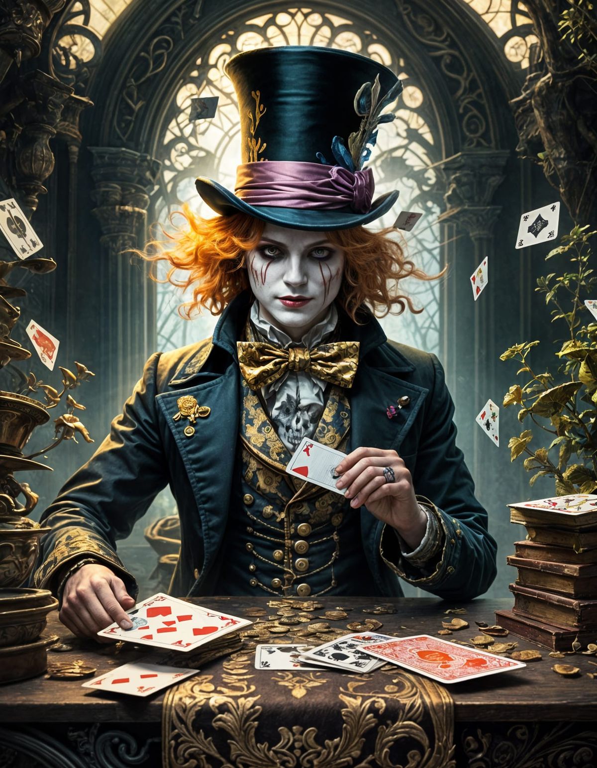This image shows a highly detailed, cinematic depiction of the Mad Hatter as a tarot card magician, featuring a half-skull face and a rich, vibrant color palette.