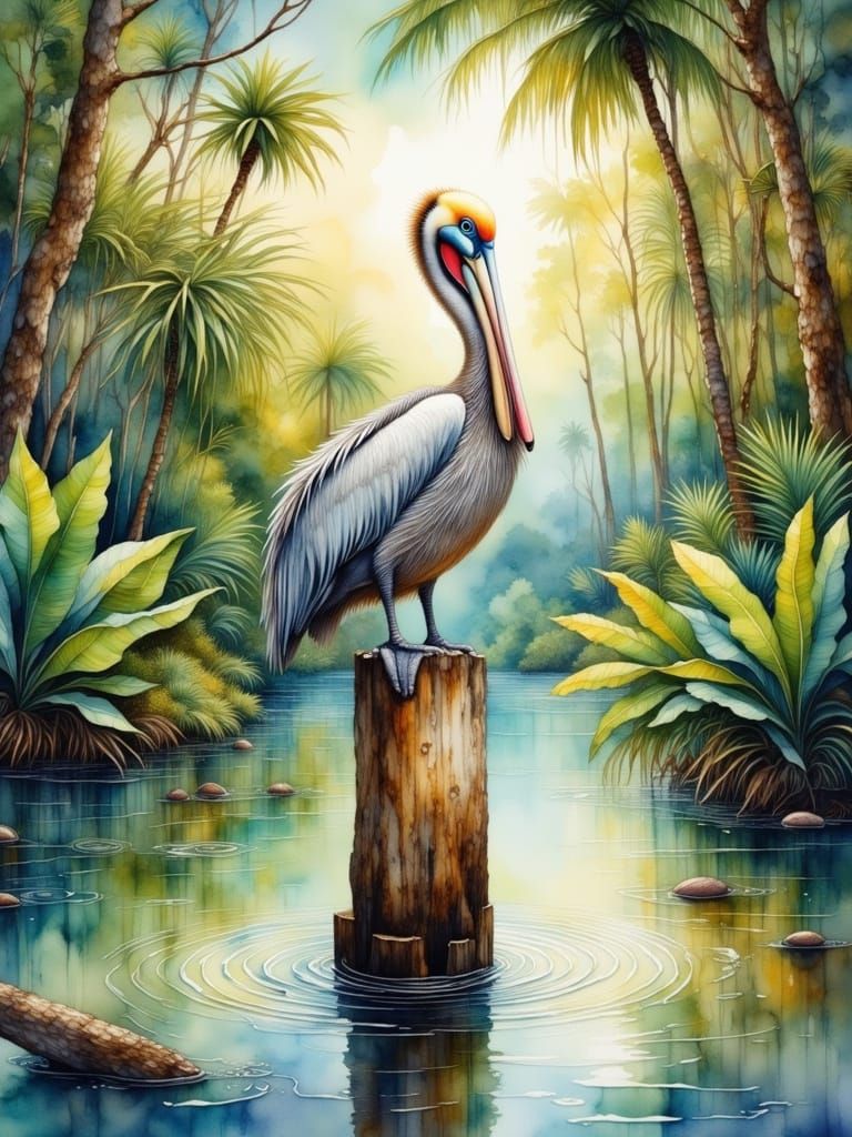 A watercolor painting shows a pelican perched on a weathered post in a tropical river, surrounded by lush plants. Thick brush strokes and layered colors create an impressionist aesthetic.