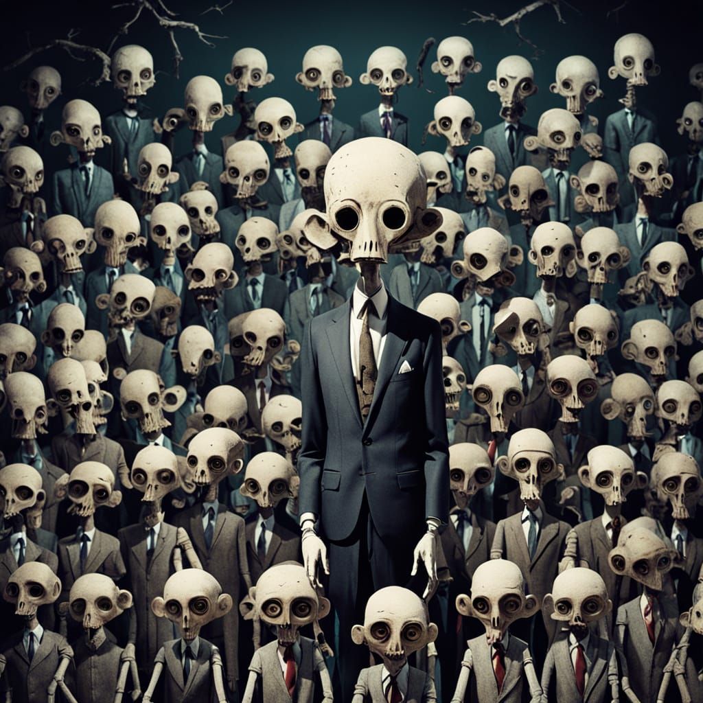This image depicts a surreal, thin humanoid figure with a large head and sad eyes, adorned with neckties. The background is a disturbing assembly of doll parts and discarded birdcages.