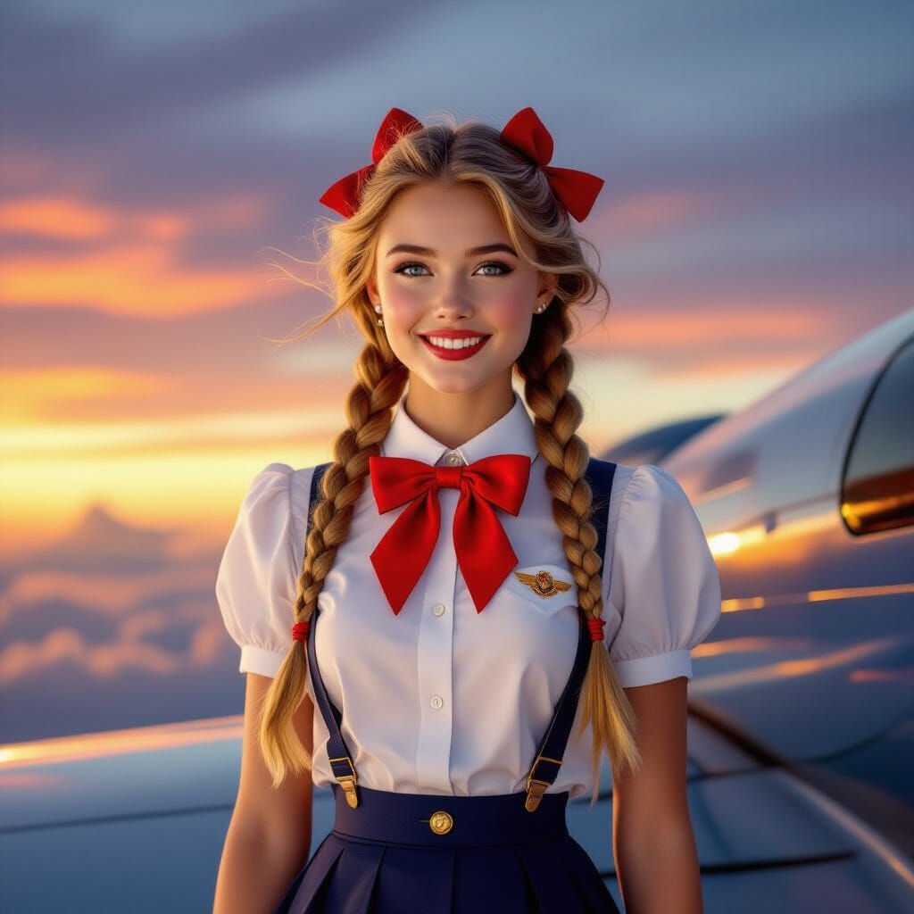 This image shows a young woman with braided blond hair and red bows standing on the wing of an airplane silhouetted against a sunset sky. The scene is photorealistic, like a cinematic film still.