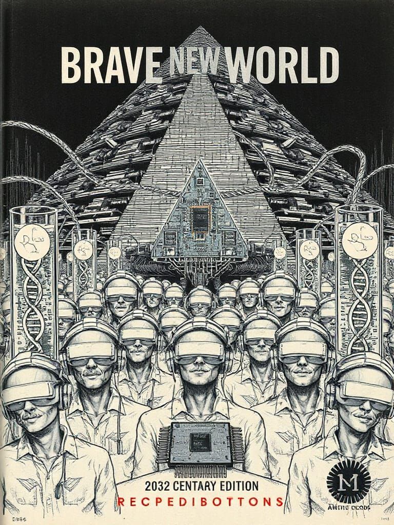 A haunting book cover illustration depicting a crowd of identical humans in VR headsets, surrounded by a futuristic cityscape, circuit boards, and glowing DNA strands, evoking a sense of unease and foreboding in a dark, muted color palette.
